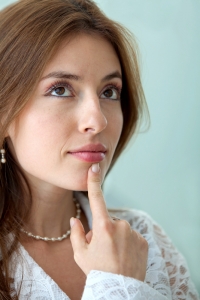 pensive business woman looking up in an office